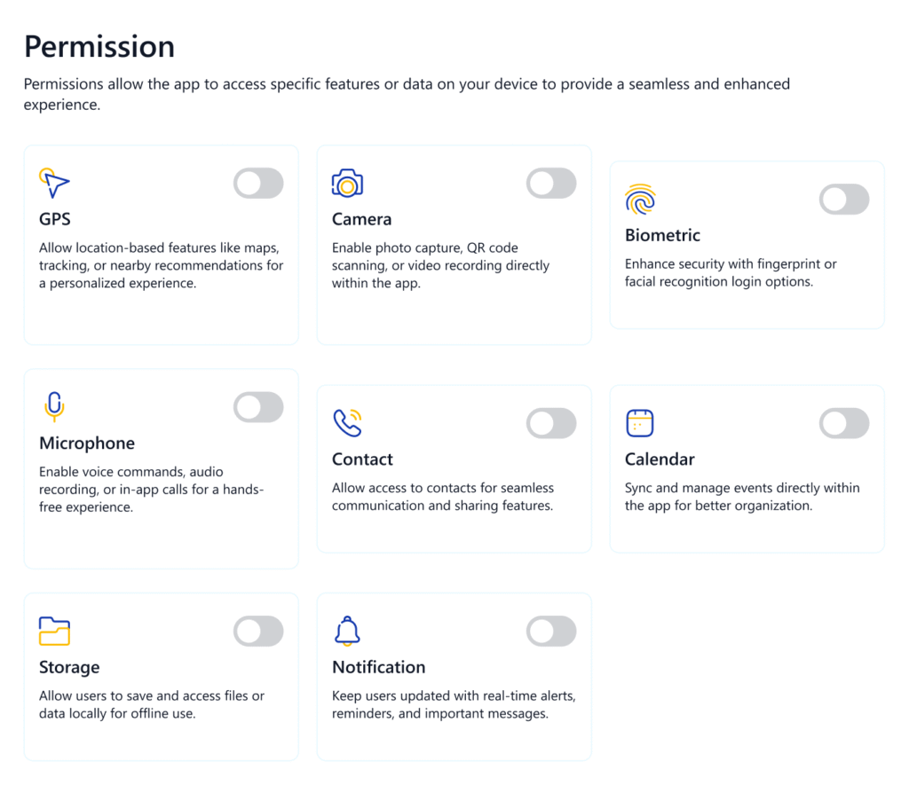 For example: Login, purchase confirmation. Biometrics offer quick, secure access without needing a password. The biometric data is stored securely on the device and not shared with the app.